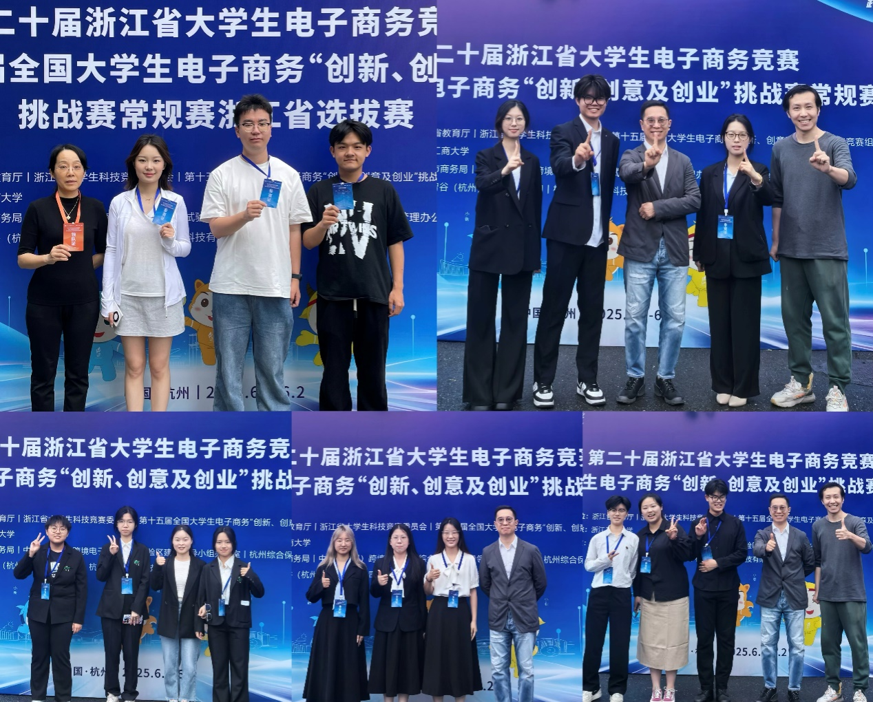 第二十届浙江省大学生电子商务竞赛暨第十五届全国大学生电子商务“创新、创意及创业”挑战赛(简称“三创赛”)浙江省选拔赛常规赛道决赛和终极赛于2025年6月1日至6月2日在浙江工商大学举行,共有来自全省96所高校的3410支团队报名参赛,其中92所高校,1162支队伍进入省赛初赛。经过专家的网络评审,共有69所高校的329支队伍入围决赛。经过激烈角逐,我校多支参赛队伍在省级竞赛中捷报频传,先后斩获省级一等奖1项、省级二等奖3项和省级三等奖4项。