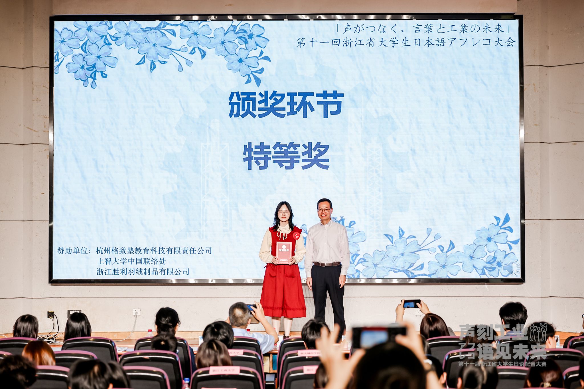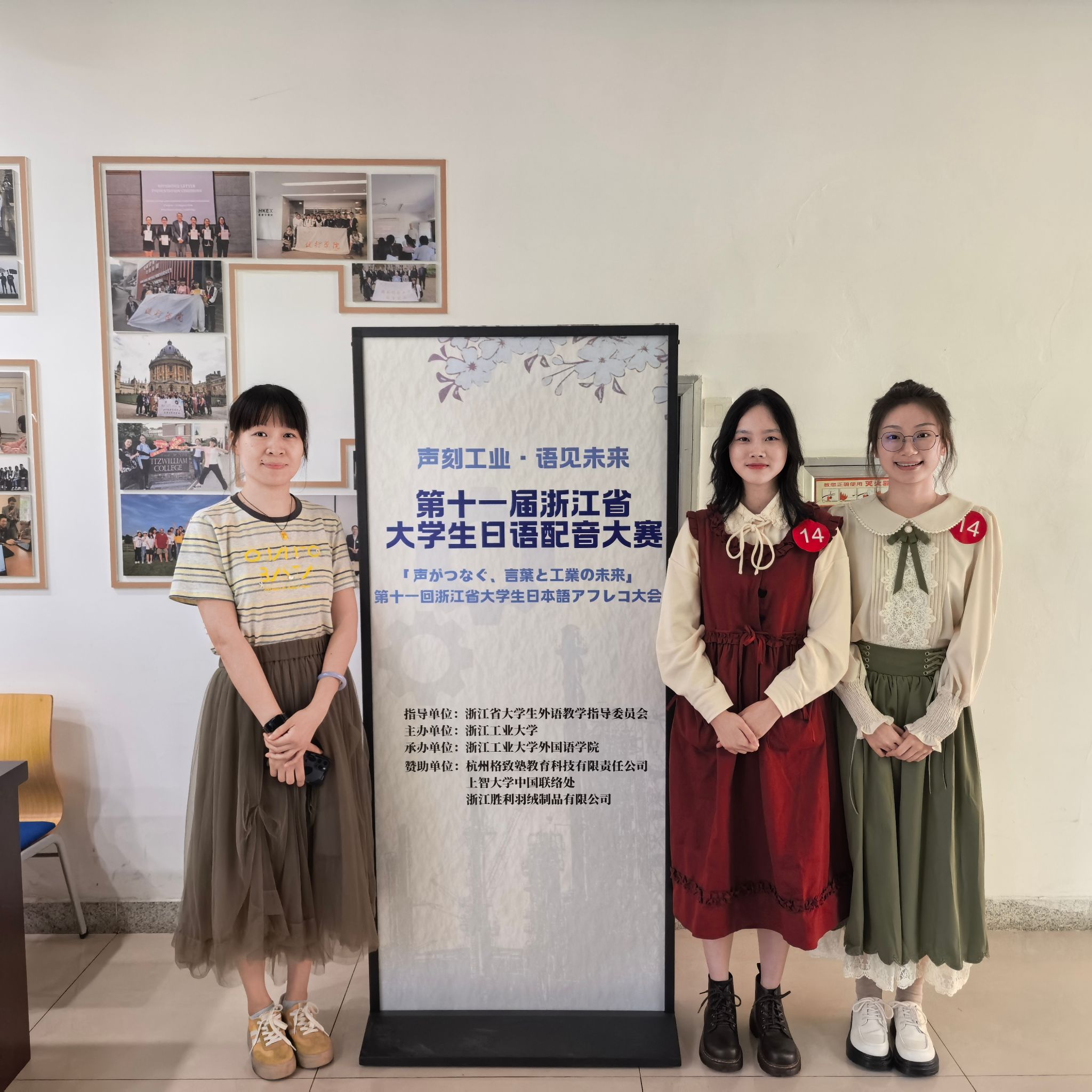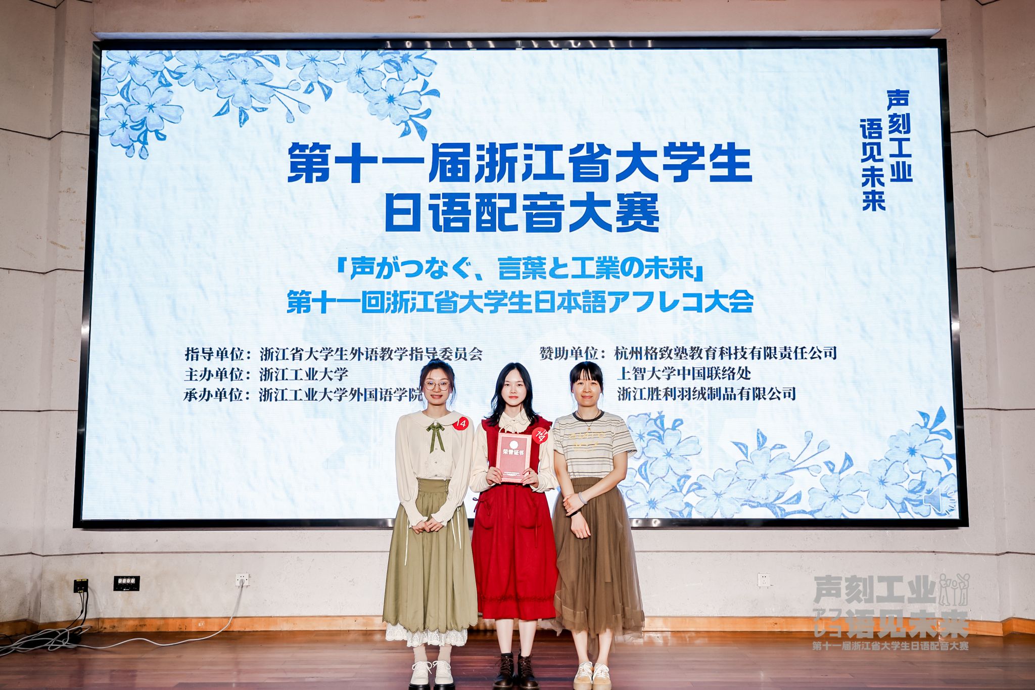 浙江省大学生日语配音大赛由浙江省外语教学指导委员会与浙江工业大学联合主办,是省内最具权威性的日语综合类竞赛。参赛选手们围绕“声刻工业·语见未来”的主题展开激烈角逐,比赛分为团队介绍及工业主题阐释、原声影片配音两个部分,评委从语音语调、情感表达、团队合作、难易程度等方面进行综合评审。我校学子选取了工业文明背景下的经典番剧《紫罗兰永恒花园》作为配音片段,通过细腻的情感把握和精准的语音控制,将剧中人物在机械文明中追寻人性温暖的心路历程演绎得淋漓尽致。她们富有张力的声线表现和天衣无缝的配合,多次引爆现场掌声,最终以显著优势拔得头筹。
