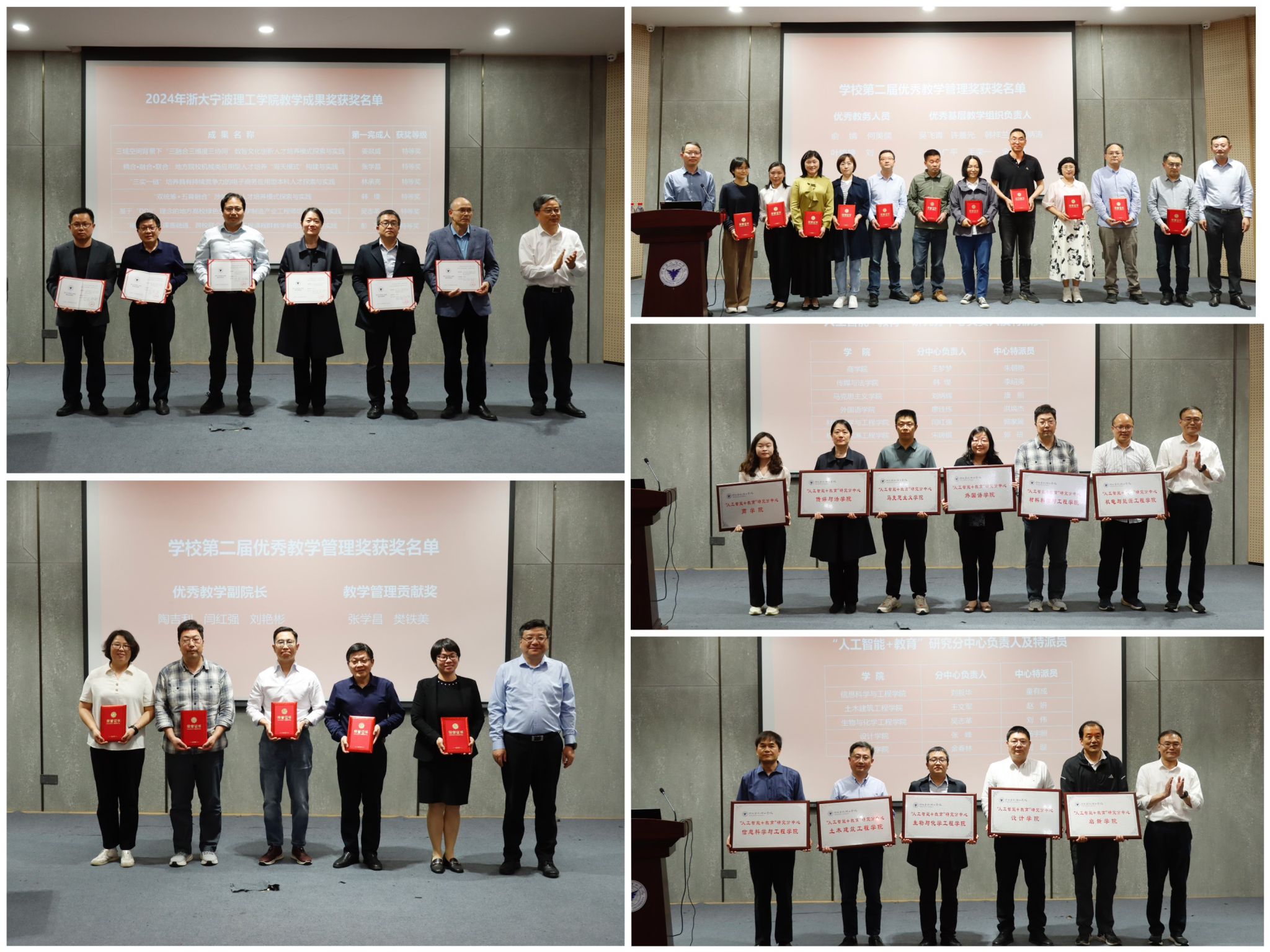 会议表彰了2024年学校教学成果奖获得者、优秀教学管理奖获得者,为11家“人工智能+教育”研究分中心授牌。同时通报了浙江省第四届高校教师教学创新大赛、2024年数字化教育教学改革优秀案例获奖名单,以及宁波市“161”工程建设项目立项专业名单。