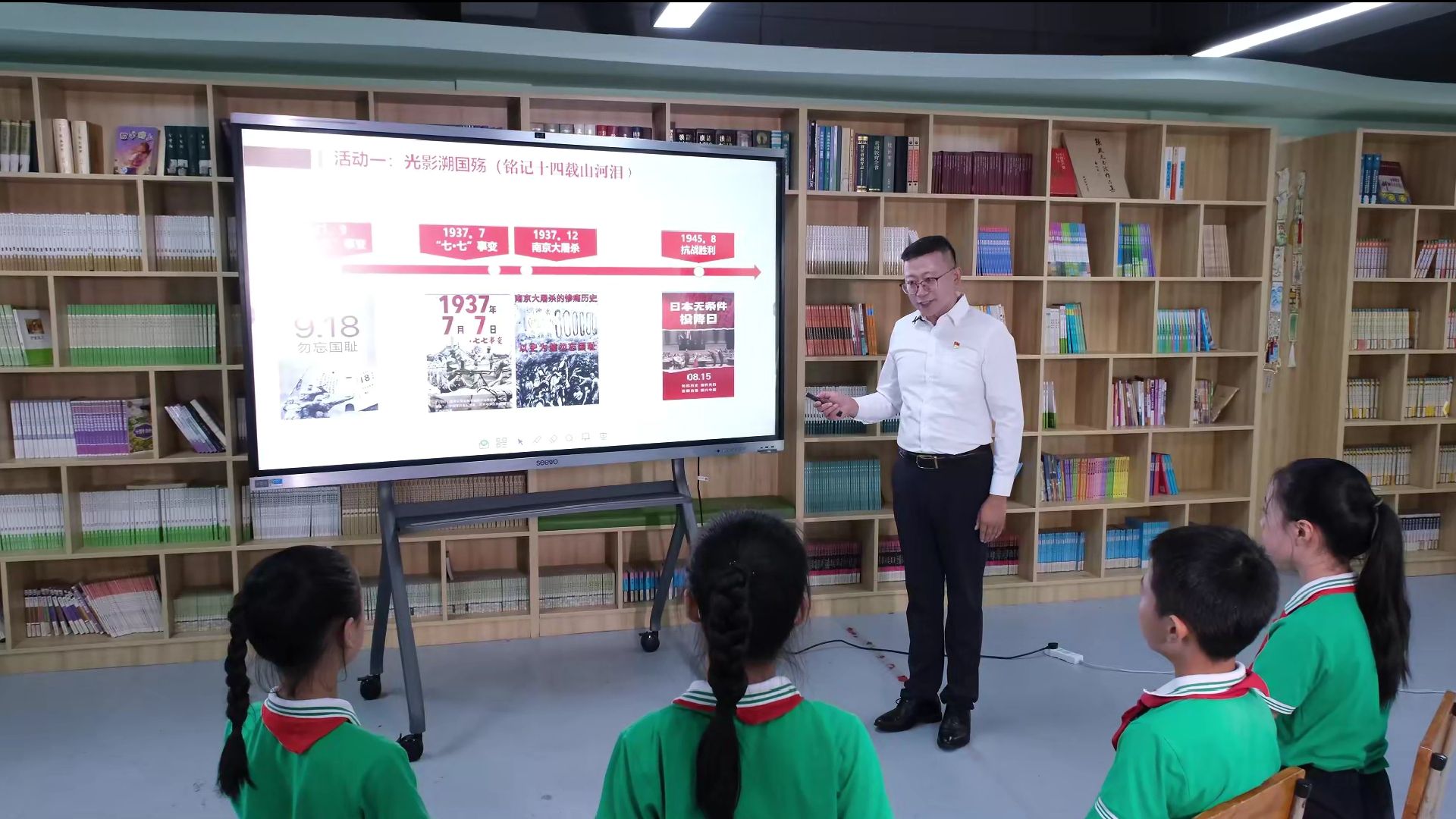 余姚市第一实验小学教育集团沈旭峰老师以电影《南京照相馆》为切入点,带领学生回顾南京大屠杀的历史真相。课堂上,学生们通过短片和讨论,认识到抗战中中华民族遭受的深重灾难。在“烽火铸英魂”环节,学生踊跃分享台儿庄大捷、英雄人物事迹,以及浙东抗日根据地的重要历史。《新浙东报》和梁弄红色电台的故事,由学生担任讲解员生动呈现,展现了中国共产党在抗战中的中流砥柱作用。