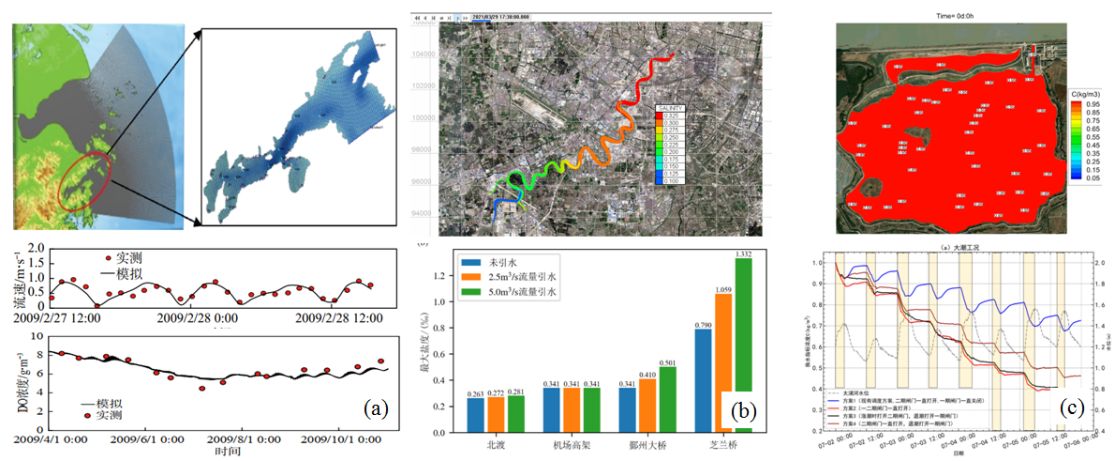 三维水动力水质数学模型应用(a)宁波象山港水动力水质模拟;(b)宁波奉化江引水效果预测;(c)嘉善白荡水库蓝藻防控水力优化调度