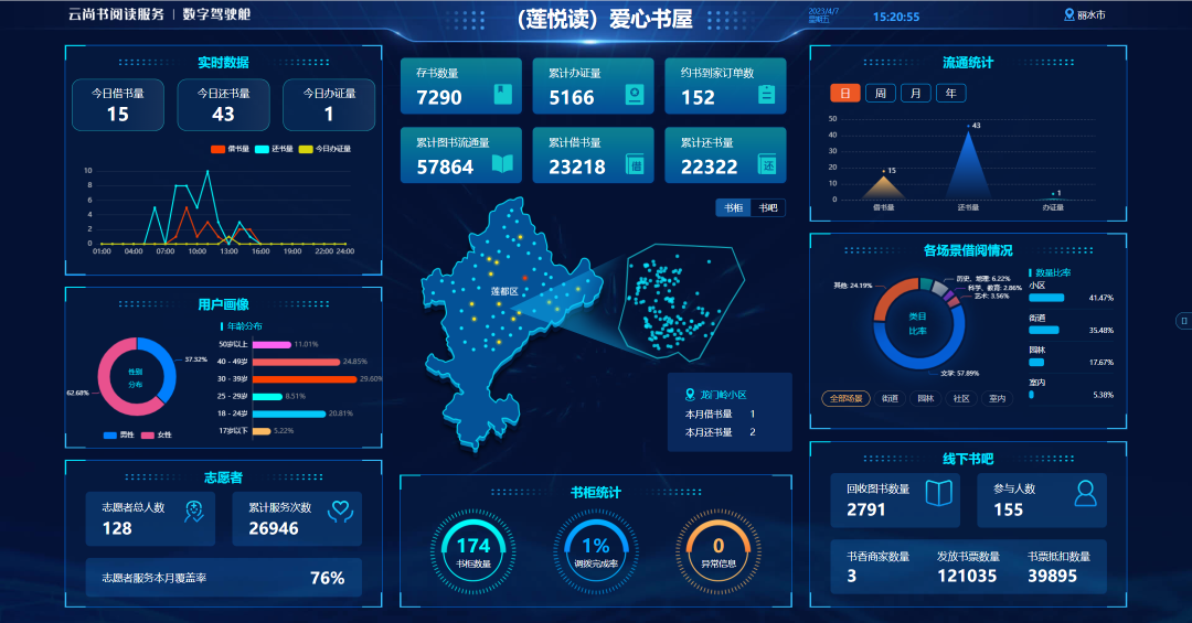 “爱心书屋”项目拥有3项发明专利,基于现代化大数据、云计算等前沿科技构建的文化云融合协同管理智能中枢,分析书屋借阅情况、馆藏量、读者构成、分布情况等,多维数智能分析,科学协助各级领导精准决策畅销图书的采购、阅读活动推广等,营造良好阅读闭环,满足读者个性化和多样化需求。