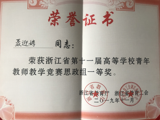 2019年,获浙江省第十一届高等学校青年教师教学竞赛思政课组一等奖