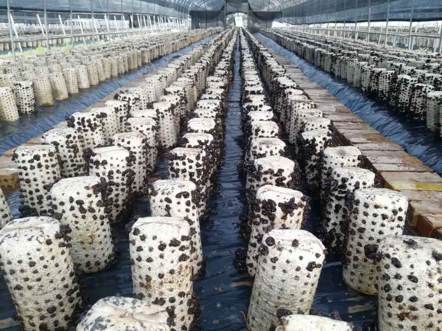 (新疆阿克苏地区柯坪县当地的扶贫产业黑木耳大棚内景)