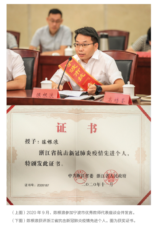 在日常教学中,陈根浪将爱与责任作为自己教育事业的初心。对于专业领域,他知无不言言无不尽,把自己的知识和经验传授给学生,做对学生有用的老师。在平时相处中,陈根浪与学生交朋友、做沟通,不会一味地灌输,学生亲切地称他为“浪哥”。他的教学评价连年获优秀,个人多次获得“校先进工作者”“宁波市‘四有’好老师”等荣誉称号。