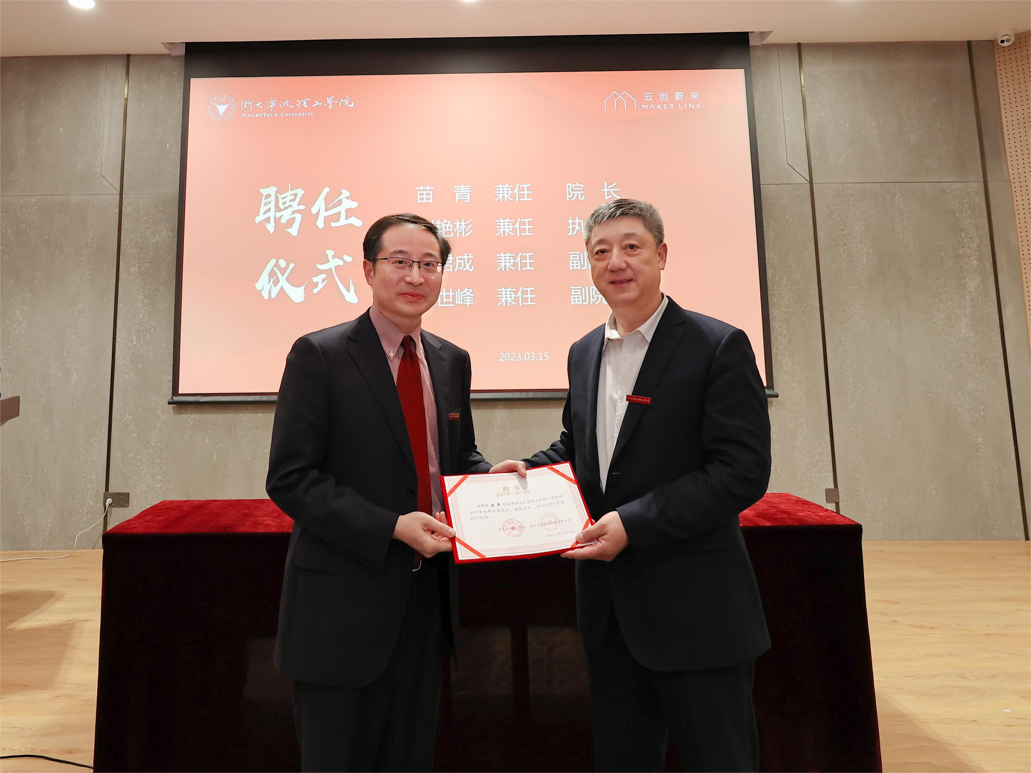 随后,胡征宇、冯建波宣读研究院院长、副院长名单并颁发聘书,聘任学校商学院院长、教育部青年长江学者苗青教授为院长,聘任商学院副院长刘艳彬教授为执行院长,商学院培训中心主任刘世峰和浙江云创浙理科技副总经理杜君成为副院长。聘任著名经济学家、浙江大学文科资深教授、浙江大学共享与发展研究院院长李实教授为研究院首席专家。