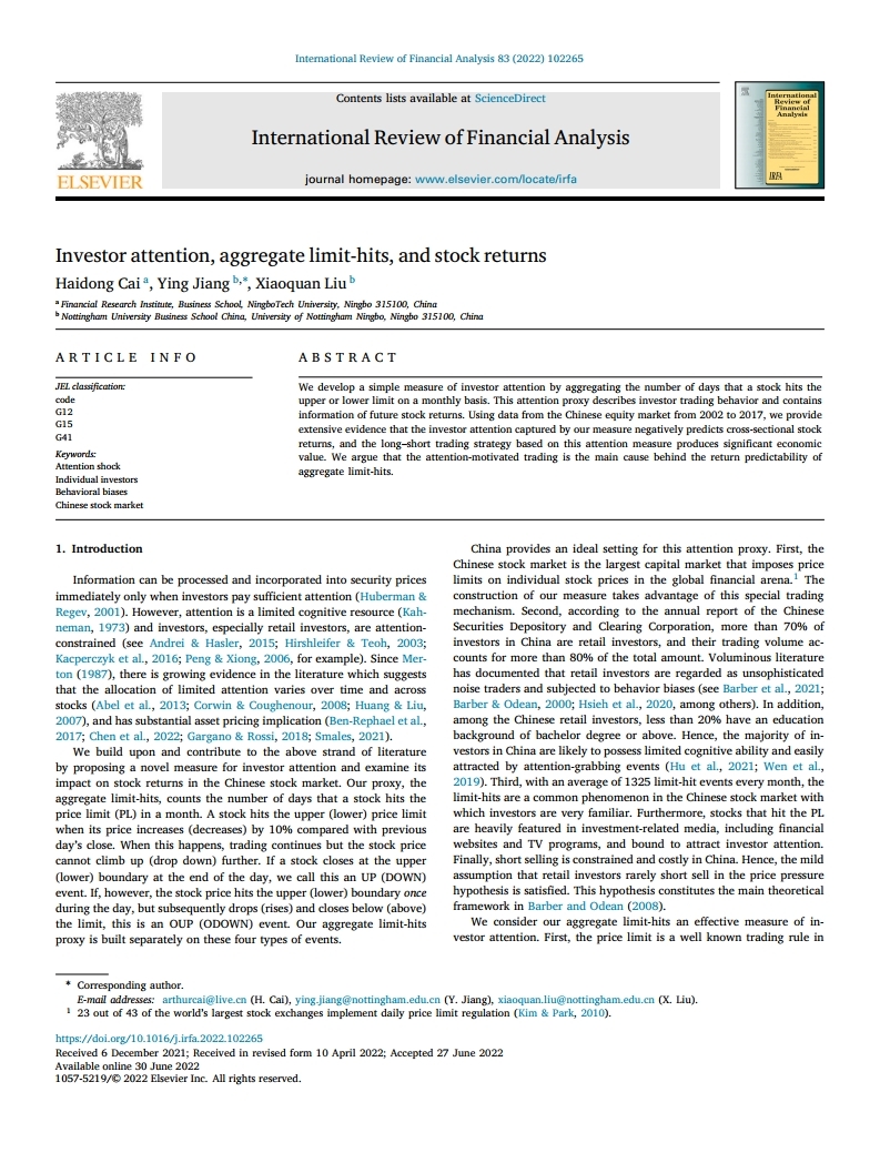 商学院青年教师蔡海东老师作为第一作者的研究论文《Investor Attention, Aggregate Price Limits, and Stock Returns》在金融领域重要期刊《International Review of Financial Analysis》第83卷(2022年)正式发表。根据JCR最新统计,《International Review of Financial Analysis》影响因子为8.235,属于金融类SSCI一区期刊,该刊也是金融领域国际公认的重要期刊。同时该文入围第三十三届亚洲金融学会年会并做宣讲。