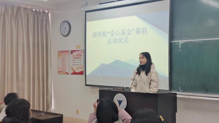 为了让爱延续,让爱永驻,12月27日下午商学院在SB202举行 “爱心基金”募捐启动仪式。商学院党委副书记、纪委书记吴琼、商学院各班班长、生活委员、学工办全体辅导员共同参加了本次启动仪式。启动仪式由商学院辅导员章浩燕主持。