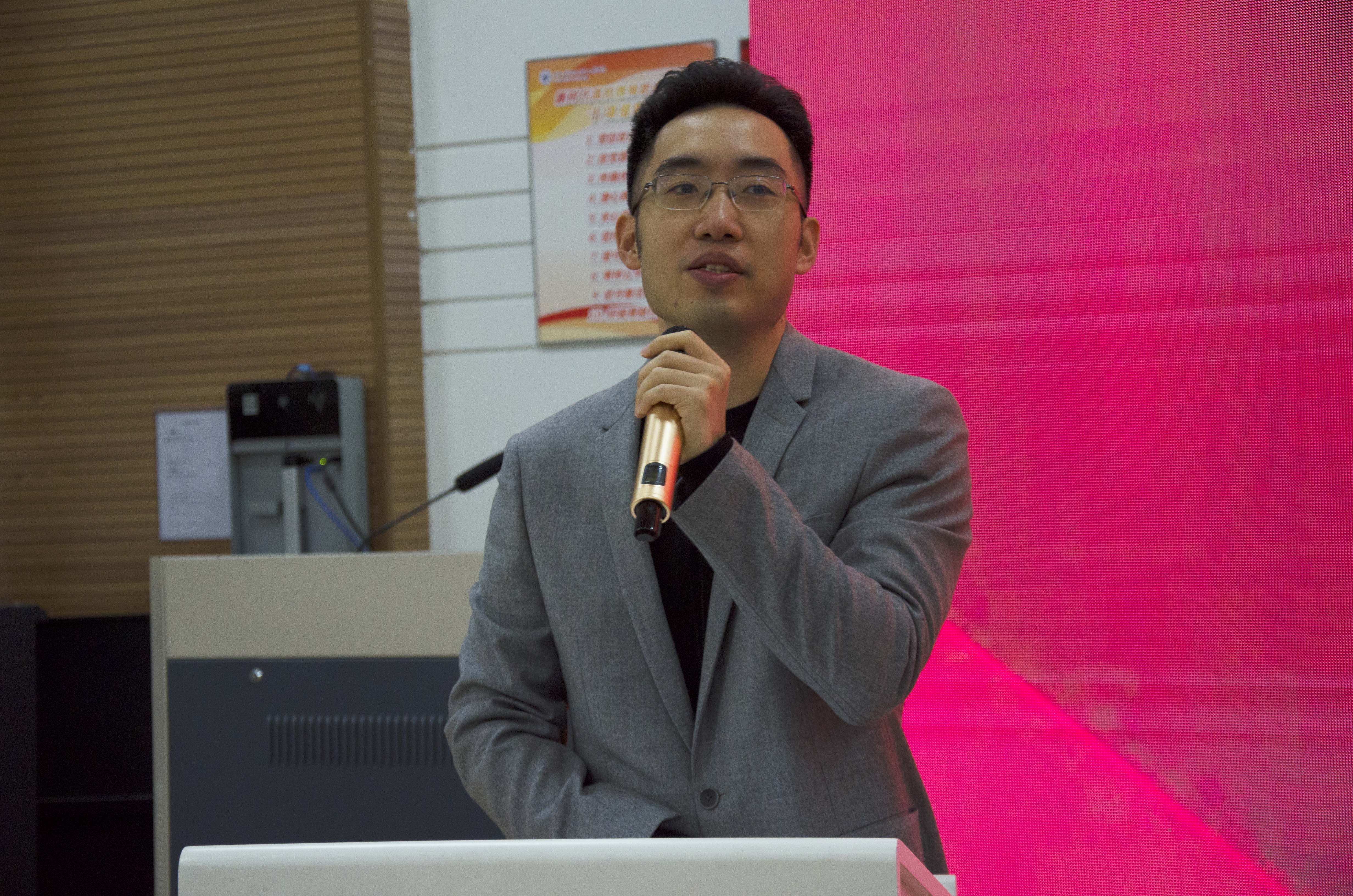 宁波锐迅眼镜有限公司董事长、02级校友王挺先生讲话。他分享了他与董震先生在大学期间深厚的友谊和这一次助学金捐助的激动心情。他表示,能够给予浙大宁理同学力所能及的帮助是一件非常有意义的事情,希望这个项目能够帮助到更多的同学。
