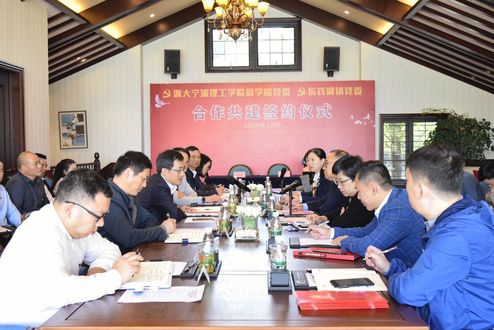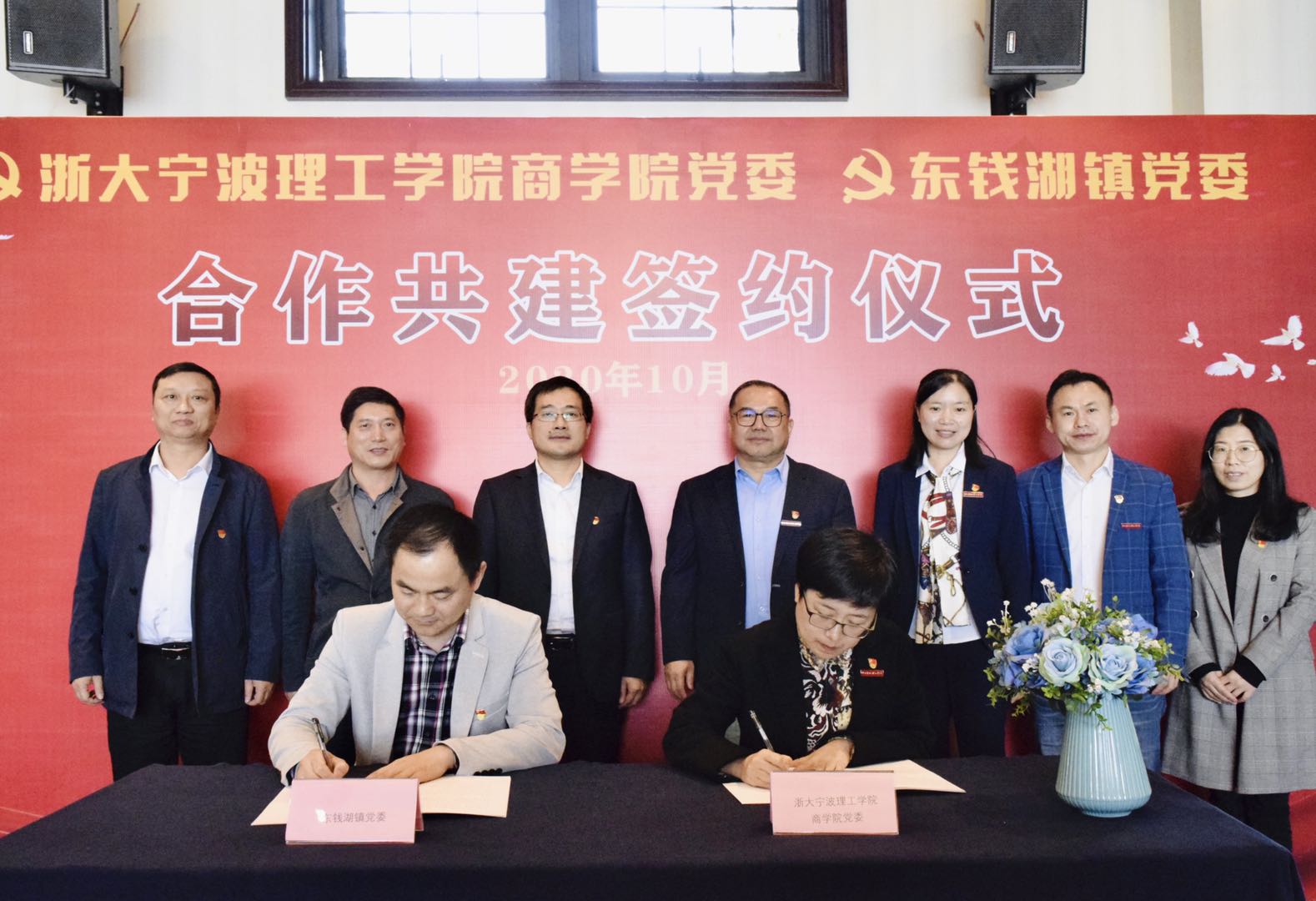 学校商学院党委委员、党政办主任苏衍宝、党委委员林巧、纪委委员、学工部副主管马双龙;东钱湖镇党委宣传委员张勋胜、武装部长张松波、党建办主任冯形松及双方共20余位党支部书记参加了签约了仪式。