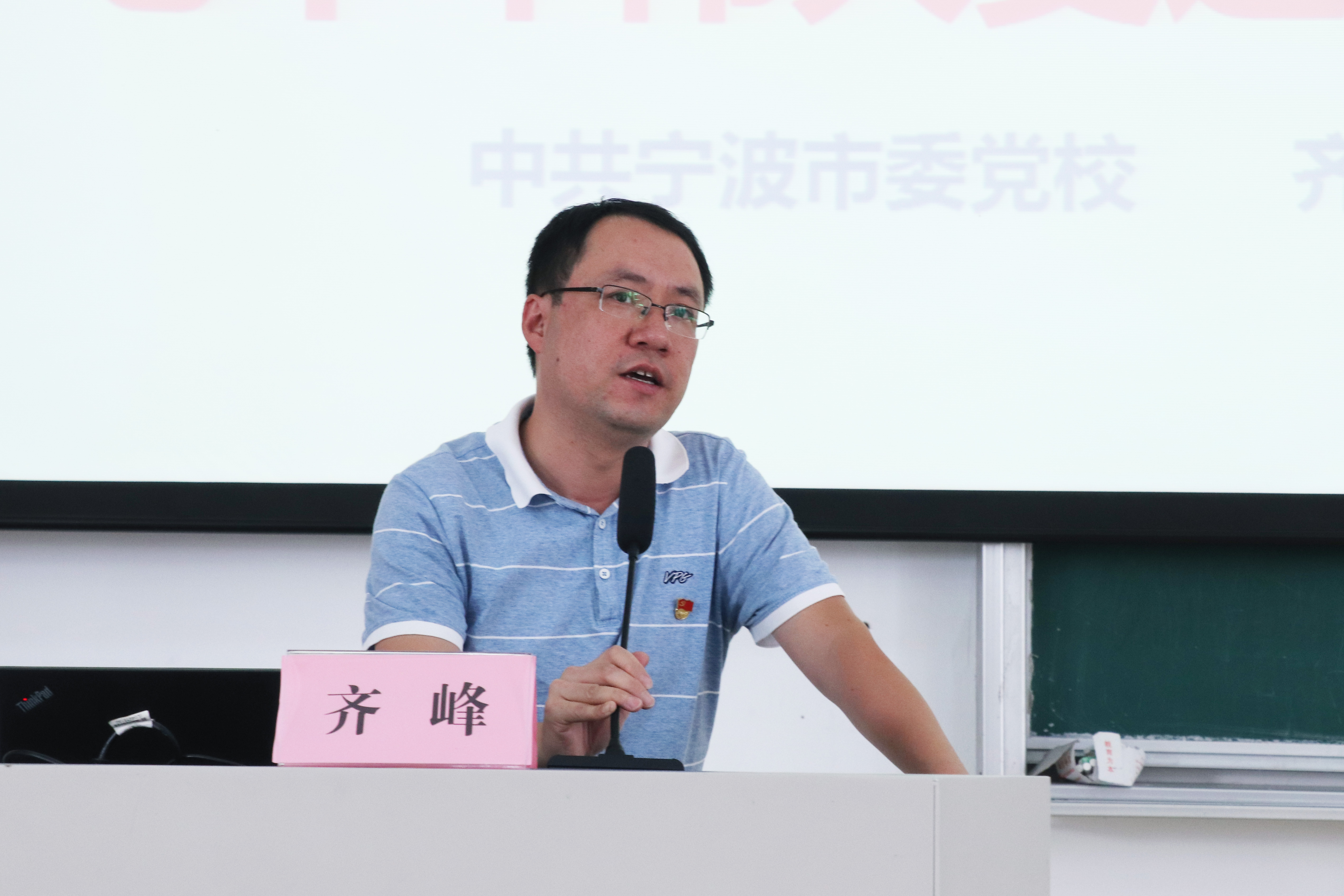 随后,中共宁波市委党校齐峰副教授作了题为“中国共产党人的初心与使命——七十年伟大变迁的根本动力”的报告。他从中国共产党人的初心和使命“从哪里来、到哪里去”两个方面进行阐述,强调中国共产党人的初心和使命,就是为中国人民谋幸福,为中华民族谋复兴。他从“红船精神”讲起,强调每位党员都应具备开天辟地、敢为人先的首创精神,坚定理想、百折不挠的奋斗精神和立党为公、忠诚为民的奉献精神,都应当为夺取新时代中国特色社会主义伟大胜利、实现中华民族伟大复兴的中国梦不懈奋斗。