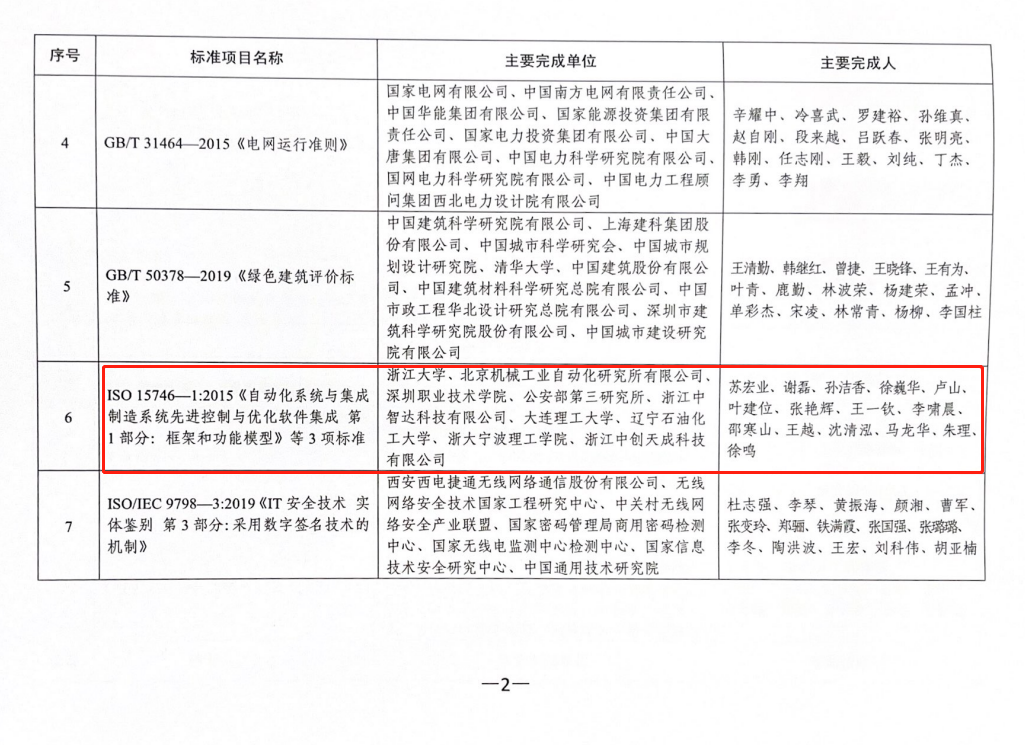 3月30日,中国标准化大会(2023)在南京召开,会上举行了2022年中国标准创新贡献奖颁奖仪式。浙江省5个项目荣获中国标准创新贡献奖,其中一等奖1项、二等奖1项、三等奖2项、组织奖1项。作为浙江省唯一的一等奖,我校信息学院院长苏宏业教授牵头制定的ISO 15746-1:2015《自动化系统与集成 制造系统先进控制与优化软件集成 第1部分:框架和功能模型》等3项标准,包括9家国内单位和15位完成人获奖。除苏宏业教授以外,信息学院马龙华教授、优秀青年骨干教师徐鸣老师参与了标准制定。