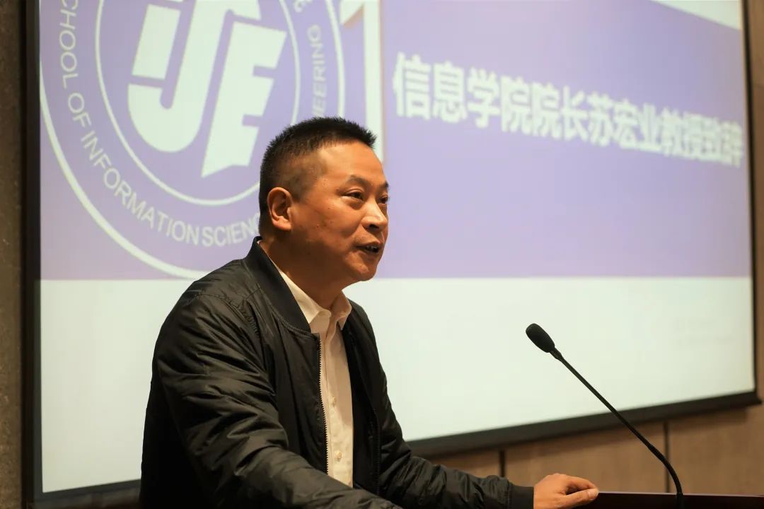 信息学院院长苏宏业教授首先代表学院致辞,对加入信息大家庭的2022级新生表示最诚挚的欢迎。苏院从行业、社会发展需求出发,指出我院各专业都是人工智能发展需要的炙手可热的专业,毕业生就业前景广,质量高,同学们的未来大有可为,他向同学们提出了三点建议:一是快速适应,锤炼行动力,二是视野开阔,培养领导力,三是不畏挫折,提升竞争力。随后,学院领导为新生代表佩戴校徽,表达期待与希望。
