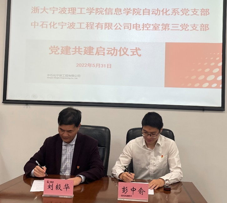 信息学院自动化系教工党支部与中石化宁波工程有限公司电控室第三党支部签订了党建共建合作协议。