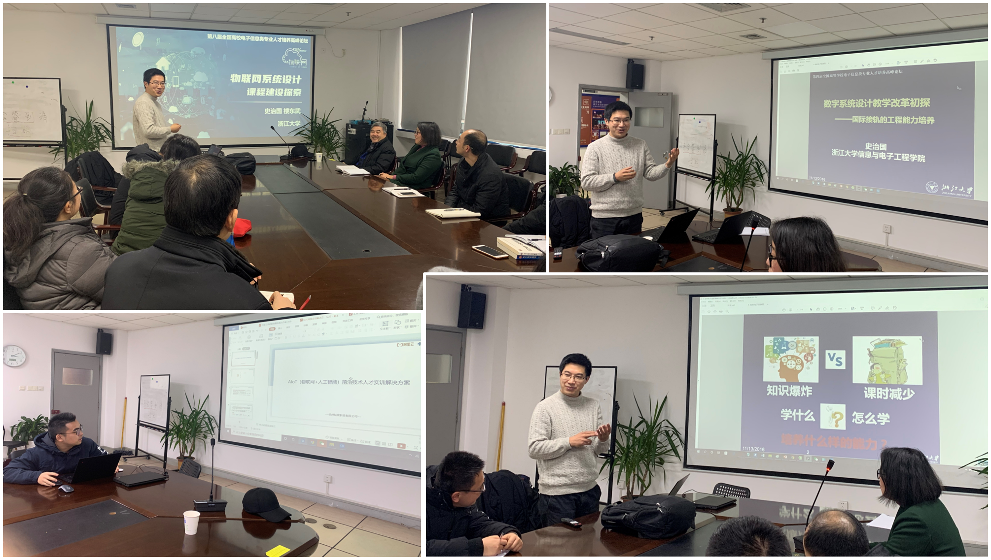 史治国以《数字系统设计教学改革初探》、《物联网系统设计课程建设初探》为题,从课程内容、教学方法、教材选用编写、课程思政、实践环节设计实施、中国大学mooc建设运行等方面介绍两门课的课程建设工作,分享经验心得。杭州钛比科技有限公司负责人作《AioT(物联网+人工智能)前沿技术人才实训解决方案》报告,为课程实践环节设计实施提供前沿技术方案。