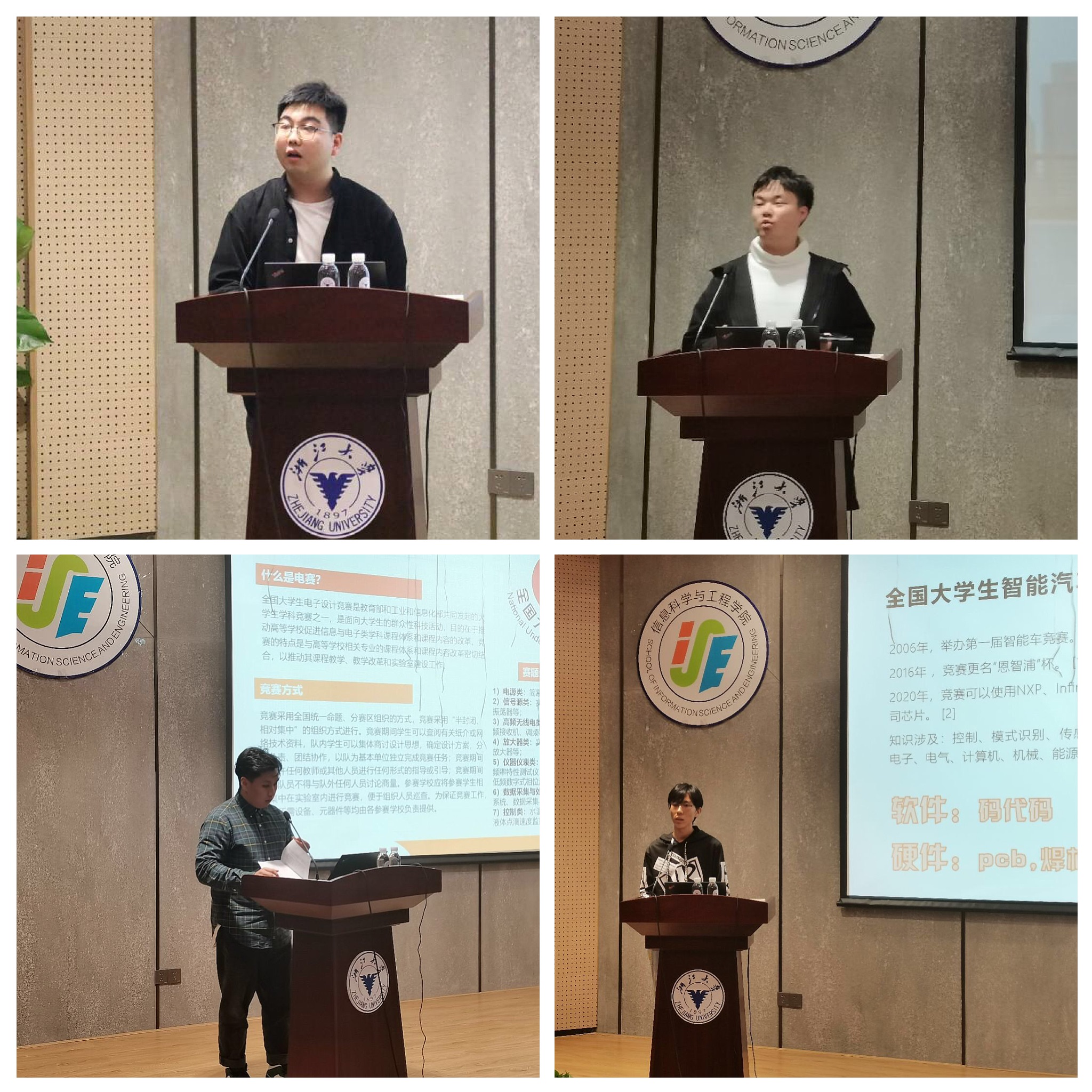 在“我与竞赛的故事”环节中,荣获第十二届“挑战杯”省一等奖的吴海旭同学,讲述了“他与‘挑战杯’”的故事。他鼓励大家在大学期间多参加实践项目,在实践中去发现生活中的“痛点”并思考,努力用自己的能力做出改变并形成体系。荣获第六届“互联网+”大学生创新创业大赛省级铜奖的张俊卿同学讲述“他与‘互联网+’”的故事。他详细讲述了做项目具体注意事项,从项目取名到招募团队、从项目分工到产品研发,干货满满。荣获浙江省大学生电子设计竞赛一等奖的郁威同学分享了“他与电子竞赛”的故事,他向我们介绍了什么是电赛、比赛类型、竞赛方式、以及比赛流程,多维度给大家展示了电赛的“别样魅力”。最后,荣获全国大学生智能汽车竞赛省三等奖的孔波波同学分享了“他与智能汽车竞赛”的故事,介绍了该竞赛的内容以及比赛规则,其中所需知识涉及控制、传感技术、计算机、机械等多个学科,鼓励大家努力学习基础知识,共创佳绩。