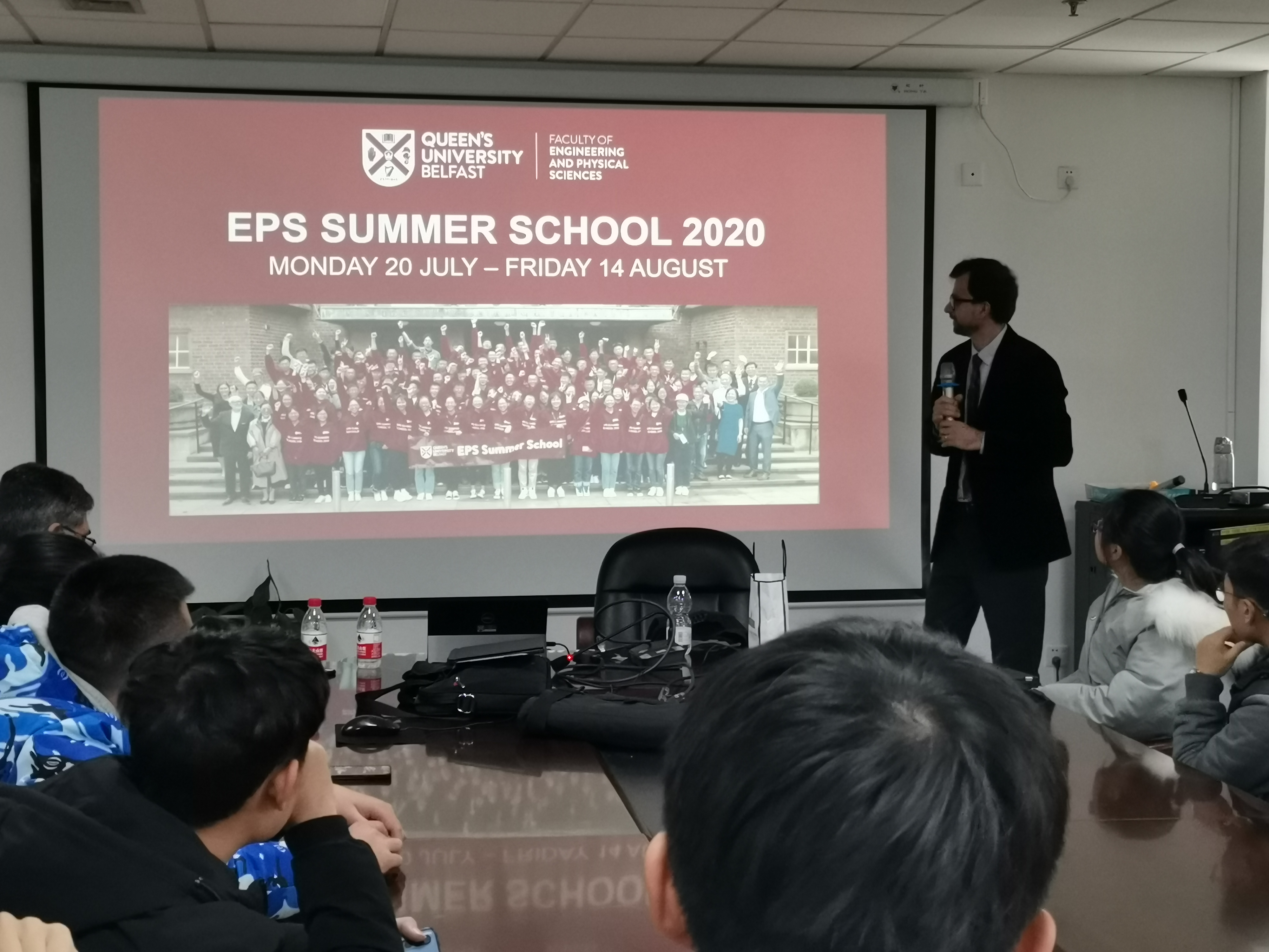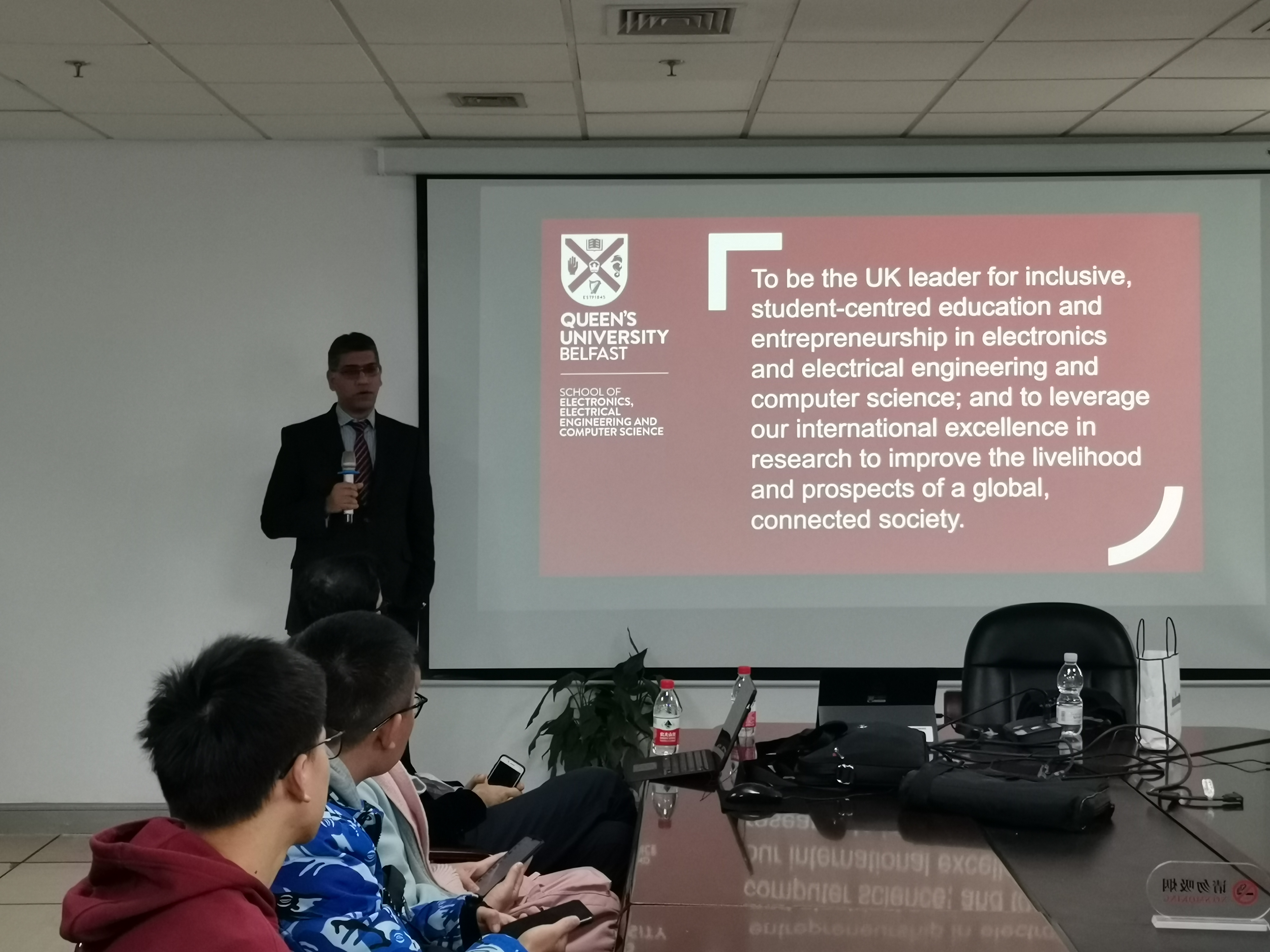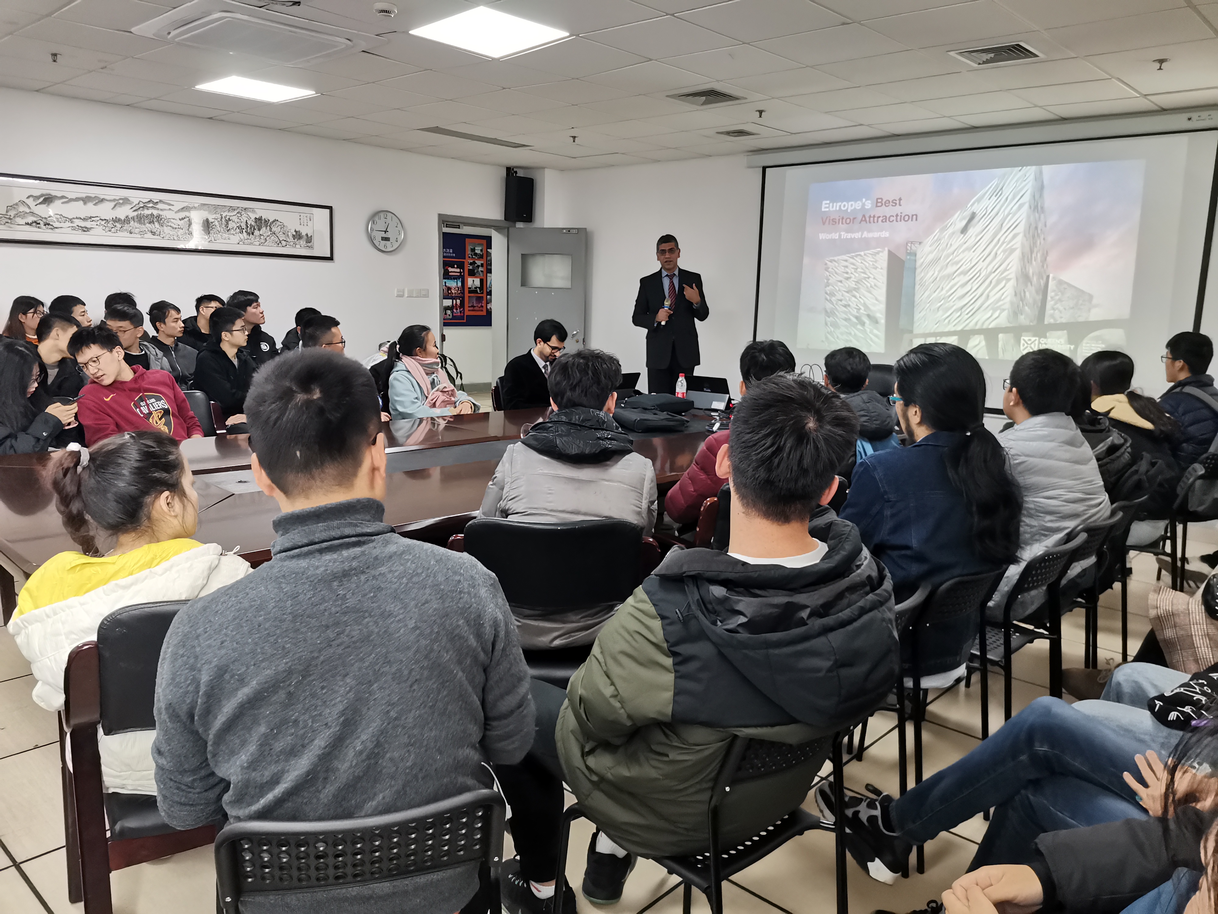 随后,来自信息学院、数据学院和启新学院的60余位同学聆听了女王大学两位老师的交流项目宣讲内容。首先,Wasif为大家介绍了女王大学的基本概况以及在国际上享有的荣誉和地位。贝尔法斯特女王大学是全球前1%的学府,各专业师资力量雄厚,教学方式新颖,注重培养学生的实践能力。Wasif用互动提问的交流方式让同学们在轻松愉悦的气氛下详细了解了女王大学的主要情况。接着Hamza博士又为在座的同学们详细介绍了summer school的相关活动安排及专业学习内容设置,启新学院的同学们积极与现场的两位老师进行互动沟通,询问了包括专业设置、交流项目详情及饮食文化等内容,会场上不时传出欢笑声。最终,宣讲会在同学们的热烈交流声中结束。