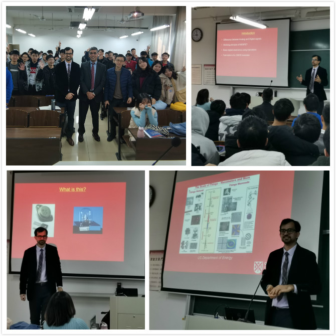 11日上午,贝尔法斯特女王大学电子电气与计算机科学学院的Wasif副教授和Hamza博士应信息学院喻平副教授的邀请,为电子信息工程171班上了一堂精彩的专业讲座。Hamza博士讲座的主题是微电子领域的半导体器件(Semiconductor Devices),他从基本的信号和电路入手介绍了MOS开关器件的类型、工作原理、制作工艺,同时也介绍了女王大学在这方面的最新研究工作,为同学们提供了一个了解国际前沿研究的窗口。课后,双方教师又进行了研讨,深入交流了在本科生教学、研究能力训练和学生国际视野拓展等方面的经验和想法。