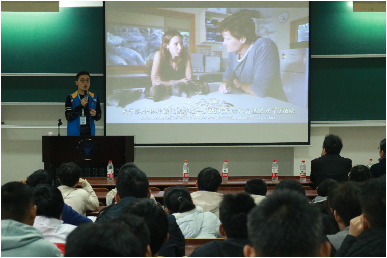 “搭把手”工作人员通过几个全球垃圾污染的短视频,向同学们展示了因为垃圾污染导致海洋生物的畸形生长,鸟类体内堆积的塑料等等现象,视频中呈现出的一幕幕污染场景令人震撼。影片之后工作人员为师生们讲述了我国垃圾分类的发展史,同时也展示了关于一个塑料瓶如何经由人类丢弃后重回人类体内的“旅程”的影片,令人胆寒。此外,工作人员还详细介绍了各类垃圾分类的方法、垃圾分类处理的益处以及处理不当带来的恶性后果。