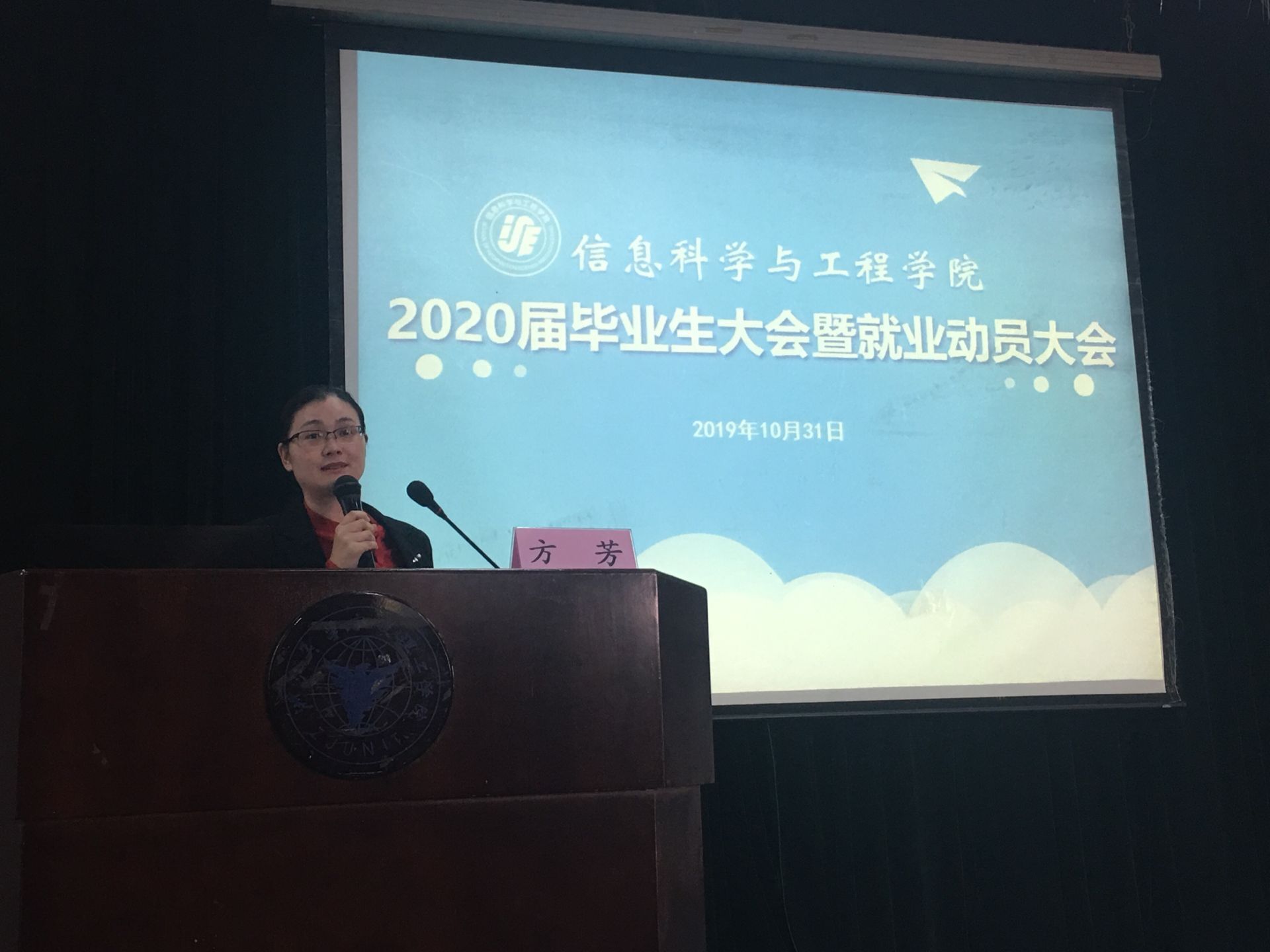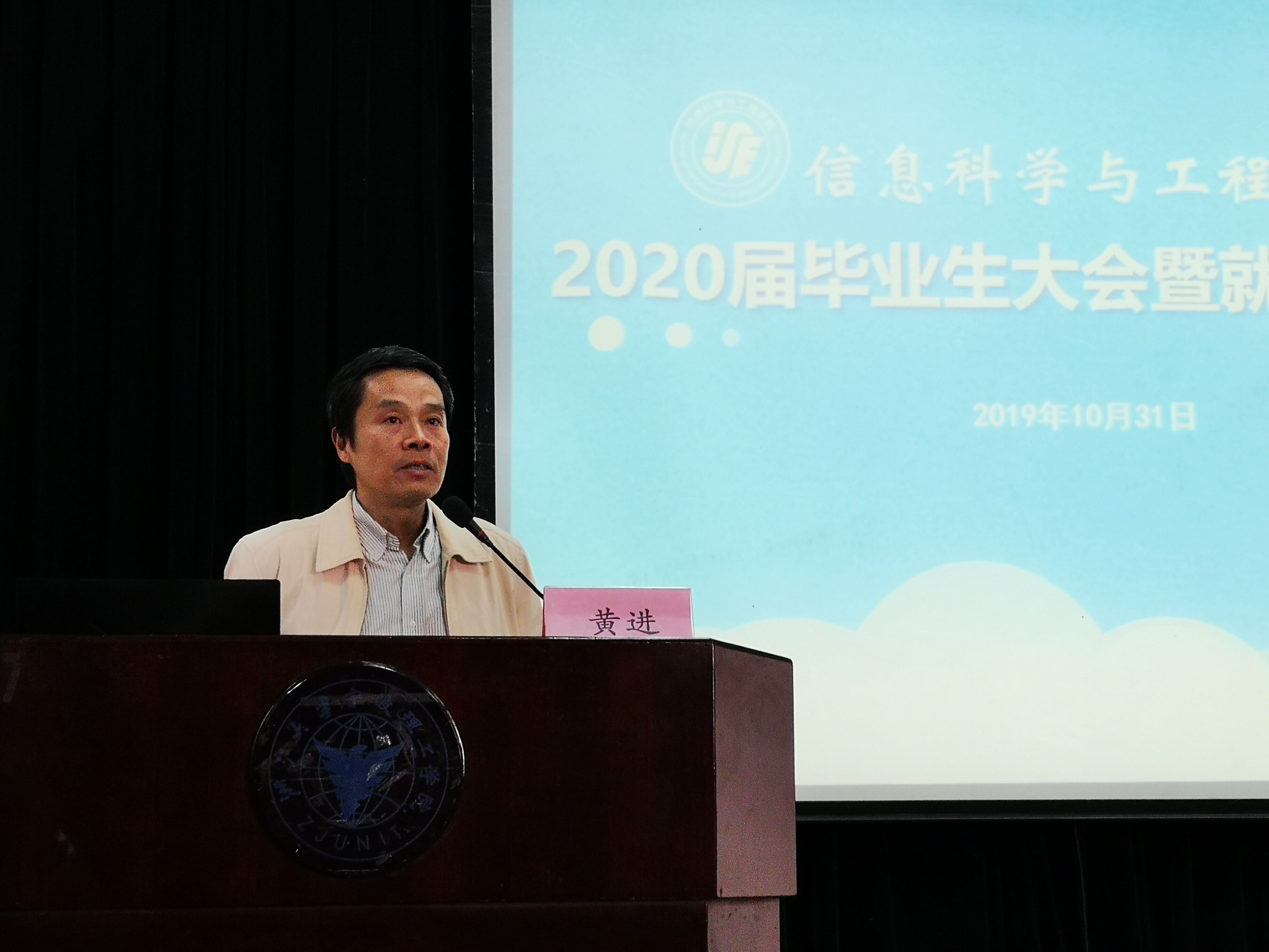 10月31日,学院全体毕业生就业动员大会召开,信息学院院长黄进、学院党委副书记方芳,党政、教务、学工等老师,以及2020届全体毕业生出席了就业动员大会。会上,黄院长就学院2019届就业工作情况及2020届毕业生总体情况进行了简单介绍;在分析了当前严峻的就业形势之下,黄院长对全体毕业生提出几点要求和希望,一要正确认识目前的就业形势,在就业过程中放平就业心态,二要正确处理学业和就业关系,科学规划职业生涯,三要打开思路、转变观念,将个人发展的小我融入社会发展、国家建设的大我中,才能更好实现自己的人生价值。最后,黄院长殷切希望信息学子们在职业发展过程中要迈稳步子、夯实根基,潜心修炼内功,借助“中国制造2025”的东风,未来成就自己的一番事业。