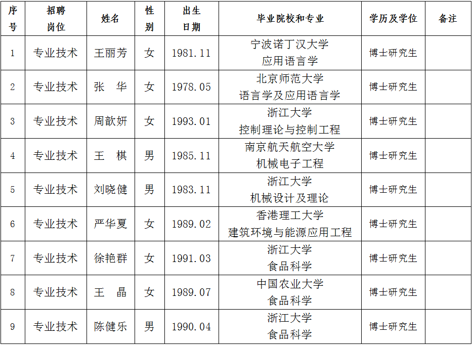 按照《宁波市事业单位公开招聘工作人员实施办法》和2019年浙江大学宁波理工学院公开招聘高层次人才(教师)公告(2019年2月14日)规定的程序,浙江大学宁波理工学院公开招聘工作通过公开报名、面试、体检和考核已进入择优聘用程序。根据面试、考核、体检结果,在合格人员中,经浙江大学宁波理工学院领导班子集体研究择优确定下列拟聘用人员,现公示名单如下: