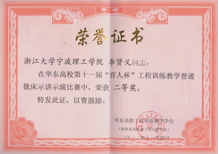 华东高校第十一届“育人杯”工程训练教学普通铣床示教比赛于11月2日至5日在中国计量学院举行,我校机电与能源工程学院工程训练中心教师李贤义在比赛中获得二等奖。
