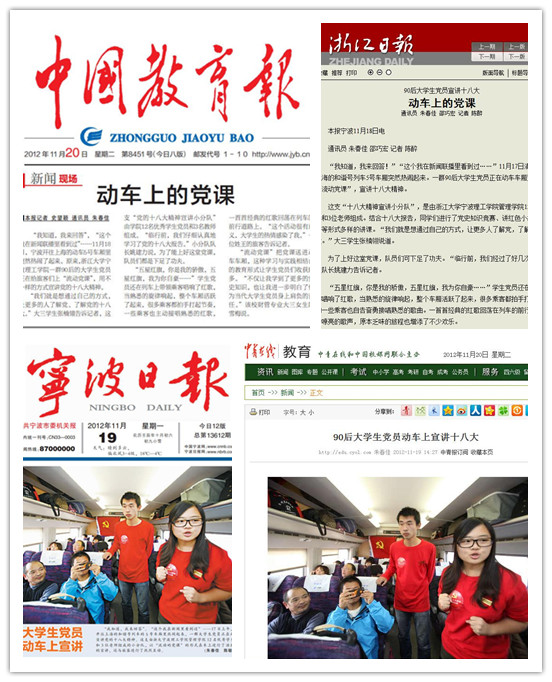 连日来,学校“大学生党员动车宣讲十八大”活动受到媒体的广泛关注。
